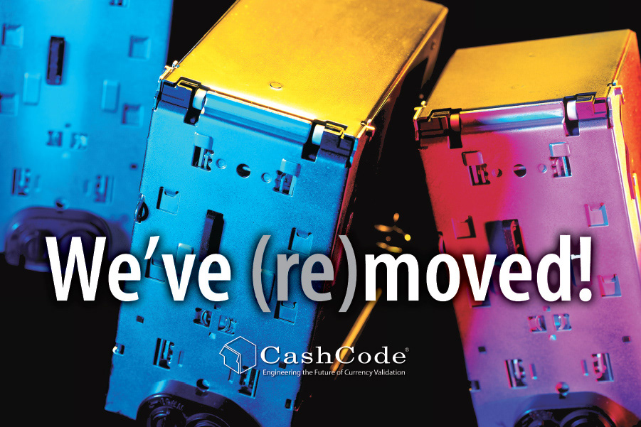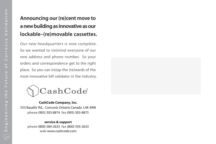 Direct mail postcard announcing CashCode's move to a new headquarters building with a bit of word-play regarding the lockable removable cassettes they are known for in the industry.