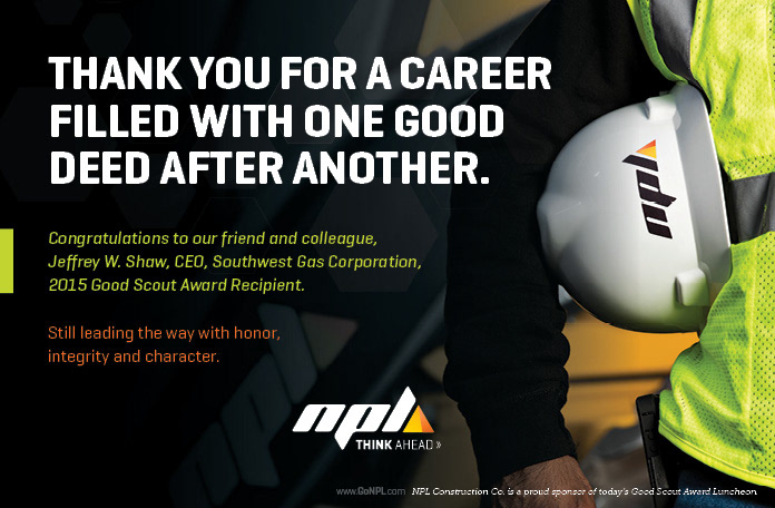 Draft of an ad I recently created for Parker Madison's client NPL showing their thanks and appreciation for Southwest Gas Corp's CEO, Jeffrey Shaw, whom was being given a special award for his years of dedication and service to scouting.