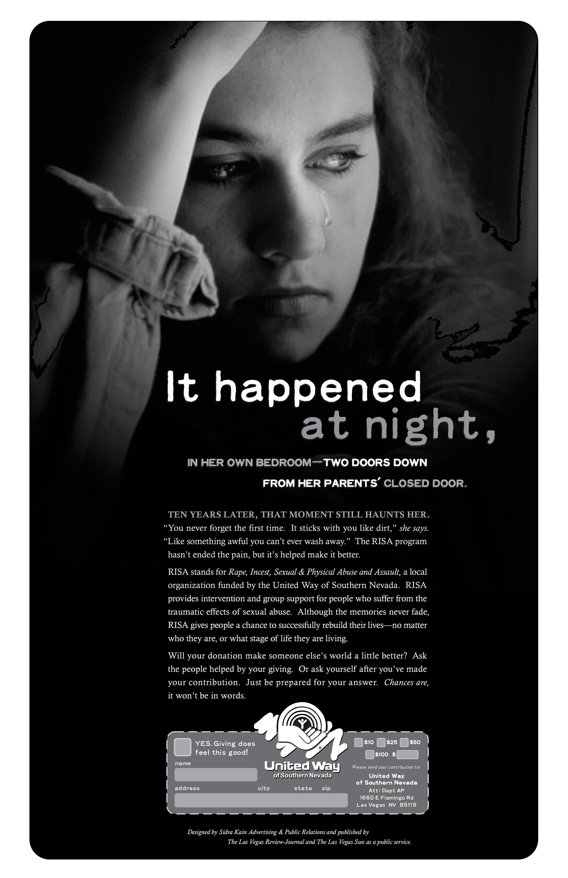Las Vegas Ad Club - Citation of Excellence winner. This print ad we did for United Way of Southern Nevada's RISA program helped highlight a program that provided assistance to victims of rape and incest.
