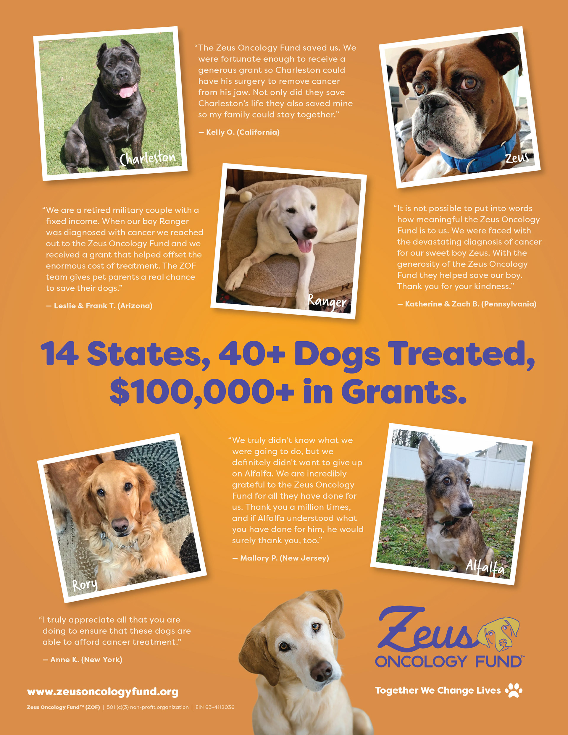 A series of ads, posters and postcards I created for Zeus Oncology Fund (ZOF), based in Scottsdale, AZ. ZOF provides much-needed financial assistance for rescue dogs in need of cancer treatment. For many, the high-costs of medical treatment for a beloved dog leaves them with a difficult choice. ZOF was created to help offset those costs to make sure that these dogs get the life-saving treatment they need. Logo credit: TBD